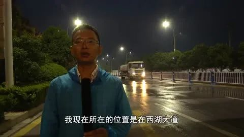 记者王世龙说:“我现在所在的位置是在西湖大道,现在是早晨5点,国庆期间这个时候可能很多朋友还在梦乡里,但是我们的环卫工人已经对路面完成了第一遍清洗。”