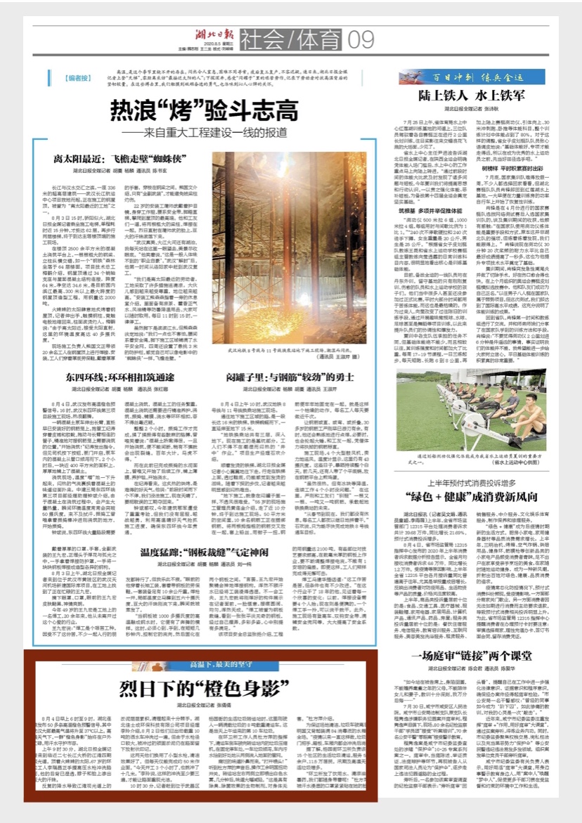 8月4日早上6时至9时,湖北连续发布50多条高温橙色预警信号,其中武汉大部最高气温将升至37℃以上。高温天气下,一群“橙色身影”始终在户外忙碌,用汗水守护市容。