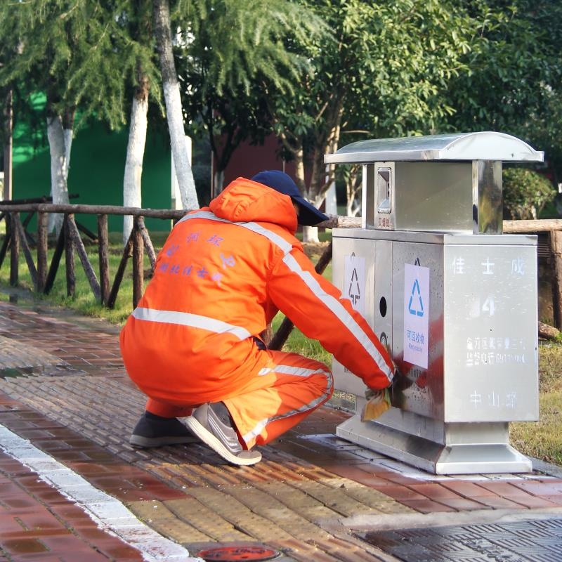 垃圾桶、果皮箱美观、整洁、无倾斜、歪倒现象,好率不低于95%。天要有专人擦洗,箱.体无乱张贴、无污迹和积尘,保持外观洁净。