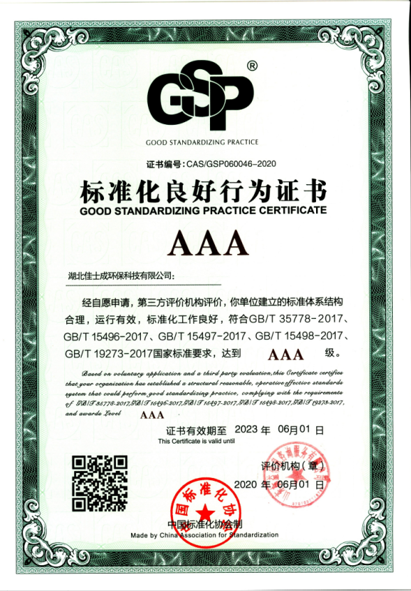 佳士成环境科技有限公司将实际工作积累的经验固化成标准文本,通过各种形式的标准化动员、宣传、培训,公司80%以上城市环卫项目部按照标准化管理,一线服务人员熟知工作流程、工作方法、考核机制。服务单位投诉持续减少,获得甲方单位的一致好评。末次会议上,验收专家组认为在创建标准化良好行为企业AAA级项目期间,佳士成环境科技有限公司全体员工高度重视,认识深入,工作基础扎实有效,管理规范、突出了自身优势,并能在工作中不断总结、创新,标准化建设成效显著,经专家组一致考评后,确定佳士成环境科技有限公司为“标准化良好行为AAA级企业”。