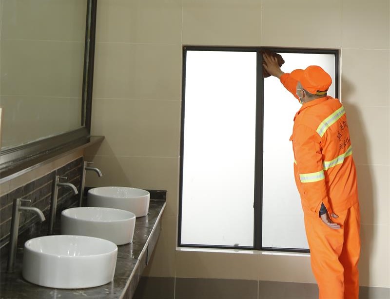 四、对公厕门窗、窗台、婴儿打理台、置物架进行擦拭。